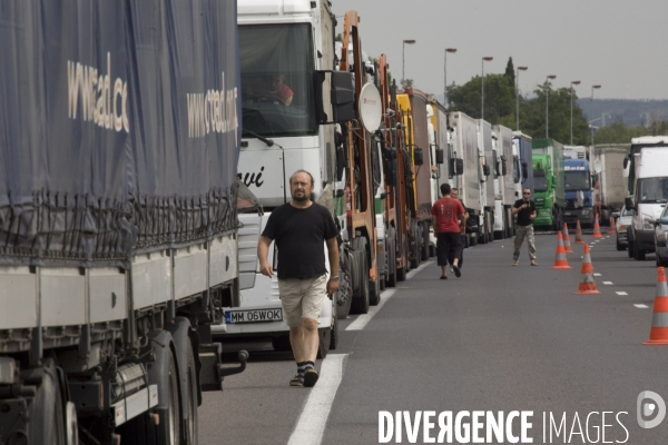 Fin du blocus de la frontiere franco Espagnole du perthus/ La Junquera le 11 Juin 2008 par les routiers francais et espagnols qui protestaient contre les augmentations des prix du carburant. Apres le deblocage de la frontiere par la police catalane les routiers stationnes le long de l autoroute reprennent leur chemin.