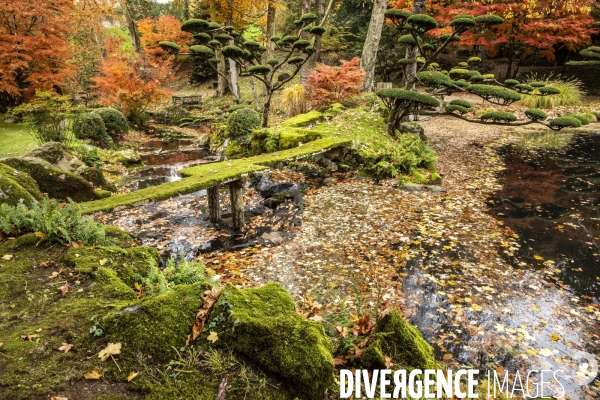 Les quatre saisons au Parc Oriental de Maulévrier, le plus grand jardin japonais d'Europe. L'automne Les feuilles mortes autour du pont décalé. cette construction est une ruse qui permet aux hommes d'échapper aux esprits malveillants...