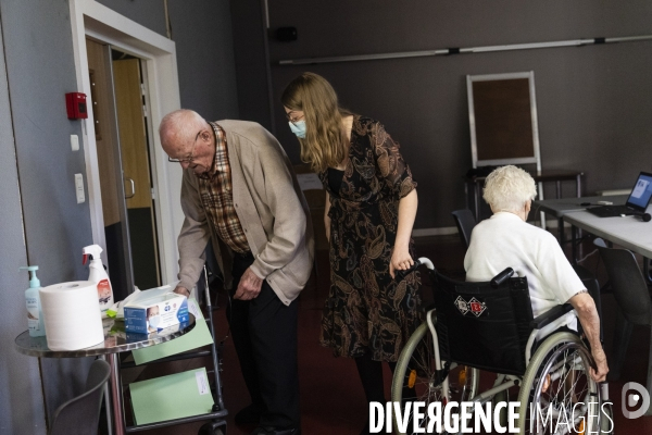 Loos, France le 18 octobre 2022 - Après le Conseils de la vie sociale (CVS) Mathilde Ysebaert, Responsable des EHPAD Jean de Luxembourg & Les Magnolias accompagne Monsieur Logier, un résident dans la salle de restaurant pour le goûter.