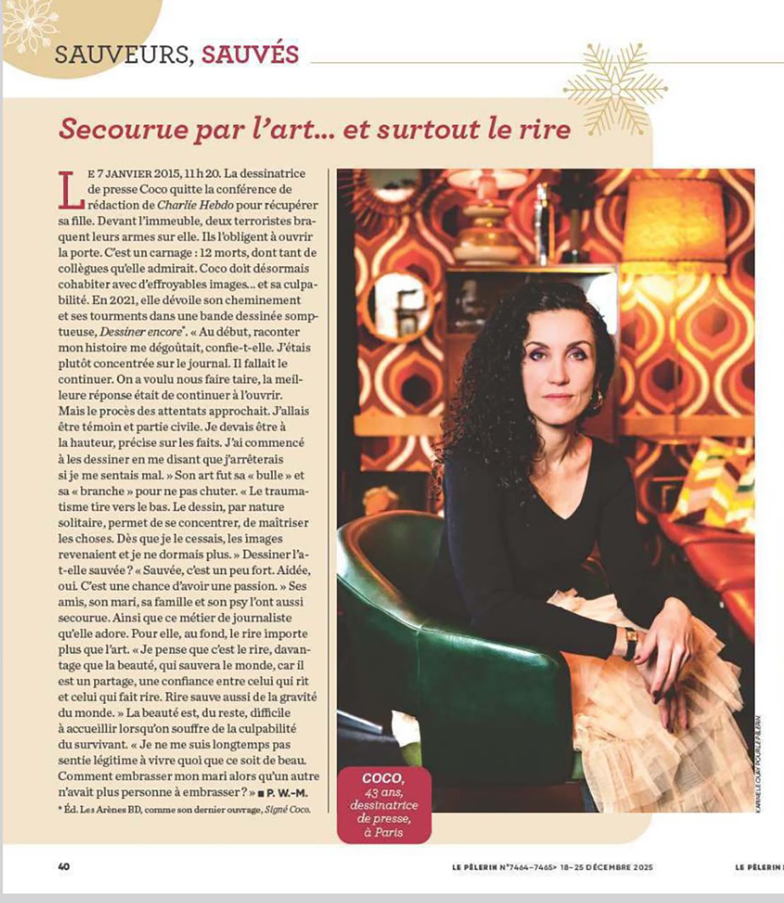 Commande pour Le Pèlerin : portrait de Coco, dessinatrice de presse, dans le cadre de la rubrique "Sauveurs, Sauvés", édition du 18 Décembre 2025. Photographie de Karine Le Ouay.