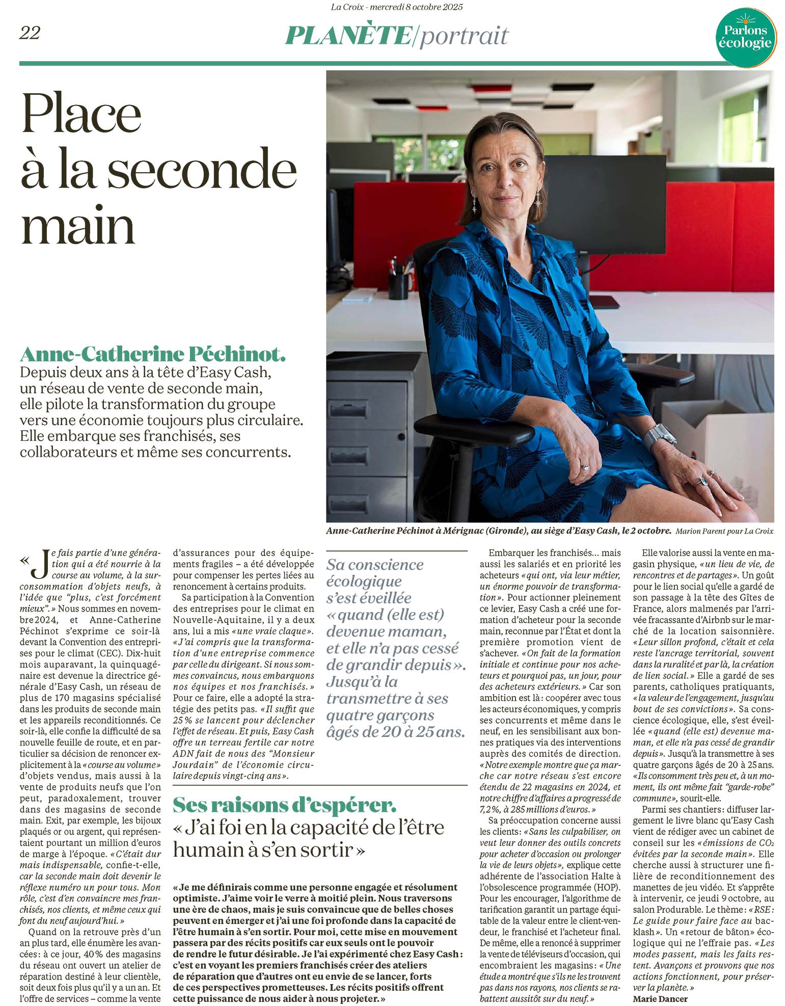 Depuis deux ans à la tête d'Easy Cash, un réseau de vente de seconde main, elle pilote la transformation du groupe vers une économie toujours plus circulaire. Elle embarque ses franchisés, ses collaborateurs et même ses concurrents.