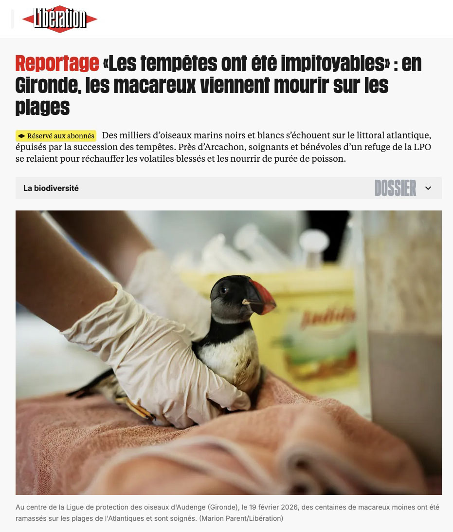 Près d’Arcachon, soignants et bénévoles d’un refuge de la LPO se relaient pour réchauffer les volatiles blessés et les nourrir de purée de poisson. Au centre de la Ligue de protection des oiseaux d'Audenge (Gironde), le 19 février 2026, des centaines de macareux moines ont été ramassés sur les plages de l'Atlantiques et sont soignés. (Marion Parent/Libération)