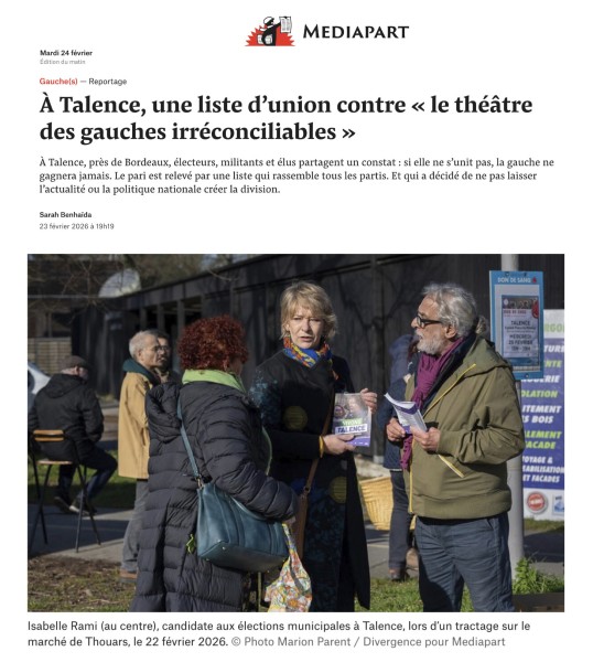 Reportage pour Mediapart * À Talence, près de Bordeaux, électeurs, militants et élus partagent un constat : si elle ne s’unit pas, la gauche ne gagnera jamais. Le pari est relevé par une liste qui rassemble tous les partis. Et qui a...