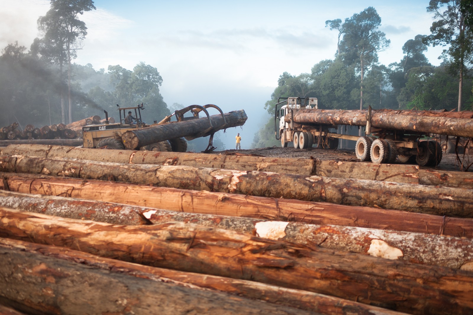 Place de dépôt de grume. Les camions de la concession convergent ici pour y stocker les troncs qui seront triés. Le permis de concession autorise le prélèvement de quelques arbres par hectare, de certaines essences uniquement. Après le passage des tronçonneuses, la forêt est appauvrie mais subsiste.