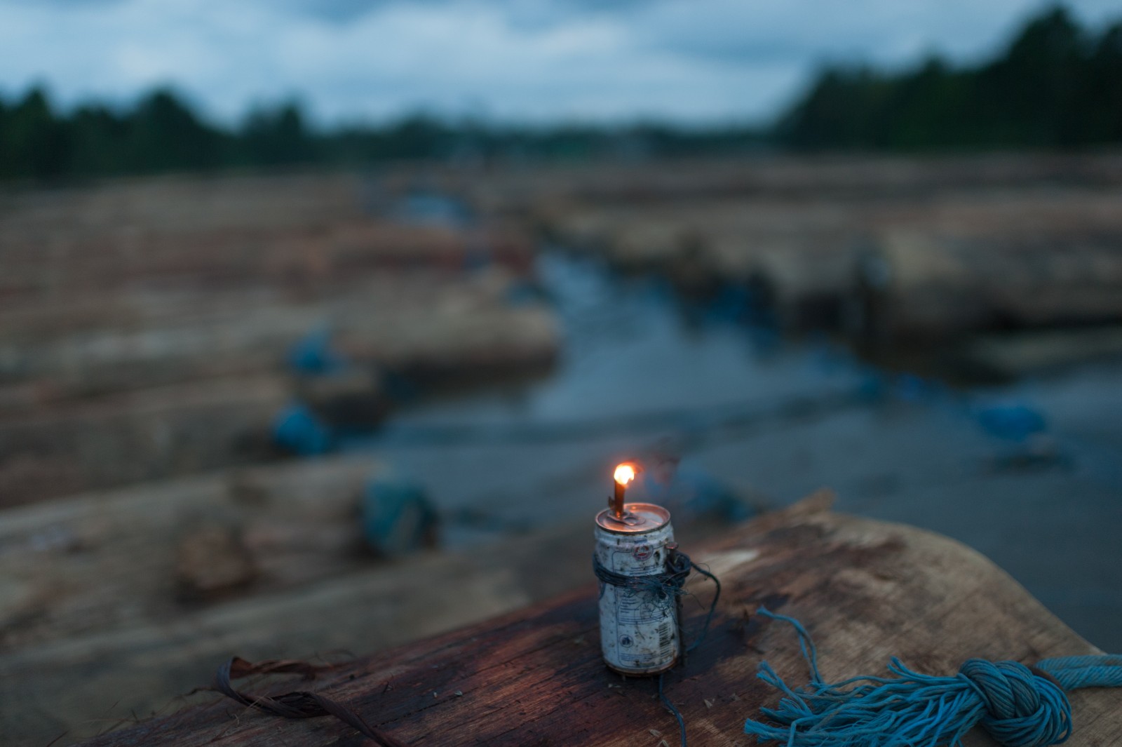 Transport de grumes sur le fleuve Lamandau. Quand la nuit tombe, de petites lampe à pétrole, improvisées dans des canettes de soda, sont déposées et allumées sur les grumes. La trajectoire des troncs ainsi que des mouvements inopportuns peuvent ainsi être repérés.