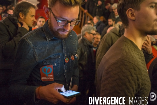 08 janvier 2017. Tourcoing. Jean-Luc Mélenchon, candidat à la présidence de la république aux élections de 2017 anime un meeting organisé au théâtre Raymond Devos. Baptisé "déboulé" par le mouvement Phi, la France des Insoumis (FI), ce genre de rassemblement se met en place rapidement suite à une actualité économique et/ou sociale sensible. Ici l'affaire de la caissière du supermarché Auchan City sanctionnée après avoir fait une fausse couche sur son lieu de travail. 900 personnes dans le théâtre et 500 à l'extrieur assistent à l'évènement. // © Olivier Touron / Divergence