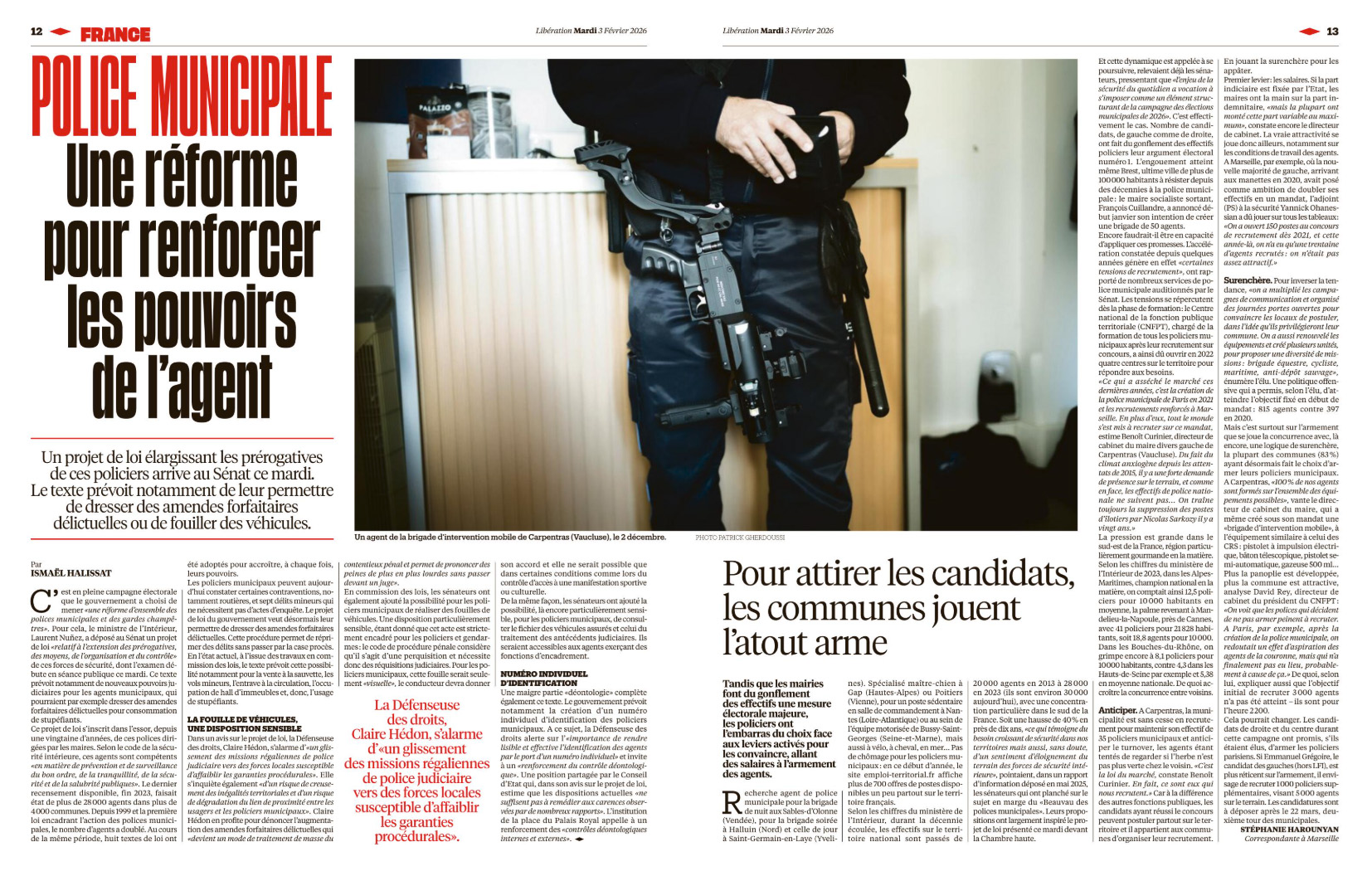Dans Libération, le projet de loi autour des pouvoirs des polices municipales.