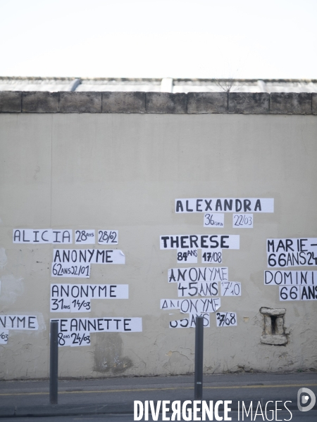 Marseille le 29 janvier 2025, bo Voltaire. Des collages ont eu lieu sur un mur répertoriant le nom,l'age et le jour du décès des victimes de féminicides en 2024.