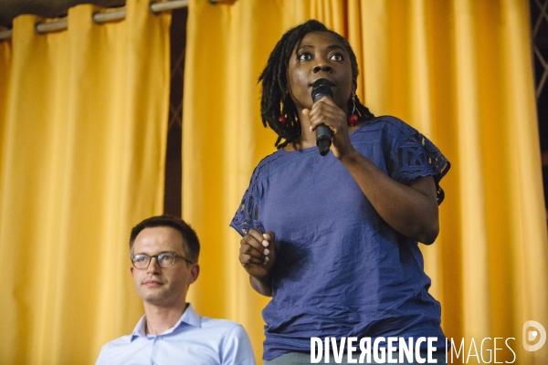 Débat citoyen avec les candidats à l'Assemblée Nationale dans le 18e arrondissement de Paris à la salle des amis de la Maison Verte (Rue Marcadet) le 14 juin 2017 en prévision du second tour des élections legislatives françaises du 18 juin 2017. Les candidats Danièle Obono (France Insoumise) et Béatrice Faillès (La République en Marche) (17e circonscription), Myriam El Khomri (ex-PS) et Pierre-Yves Bournazel (LREM) (18e circonscription) ainsi que Valérie Nahmias (UDI) débattent devant 200 habitants du quartier pendant 2 heures. Sur la photo, la candidate de la France Insoumise, Danièle Obono, 36 ans. A sa droite, Pierre-Yves Bournazel.