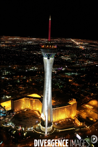 Mots clés : Las Vegas, Nevada, USA, Etats-Unis, casino, hotel, jeu, game, ville, city, dessus, from above, batîment, building, Strip, Las Vegas Boulevard, néon, light, electric light, lumière, rue, street, voiture, car, Stratosphere Tower