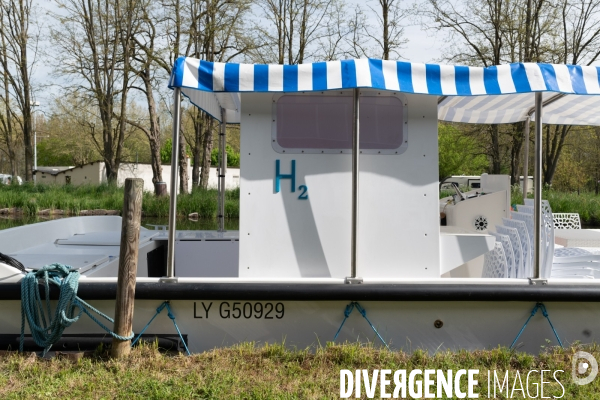 Bapteme de l'eau du bateau a hydrogene de l'entreprise les Canalous devant le chantier naval. Le bateau est un systeme hybride d'electricite et d'hydrogene. Le moteur est electrique, il est ensuite alimente et recharge via une pile a combustible. Le reservoir a hydrogene se trouve dans le petit caisson du fond. Digoin le 28 avril 2023.