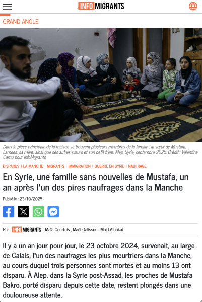 Publication reportage "« La mer a emporté mon oncle » : des exilés disparaissent dans la Manche sans laisser de trace, tarvail collectif avec les journalistes Maia Courtois, Simon Mauvieux, Mael Galisson et Nicola Kelly, avec le support de JournalismFound...