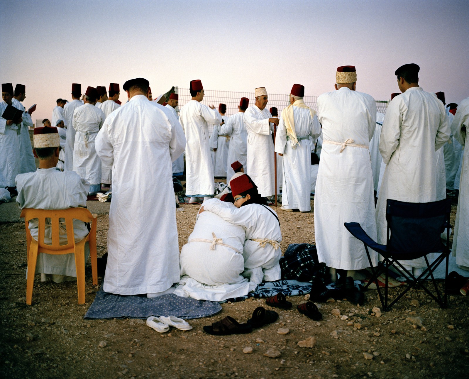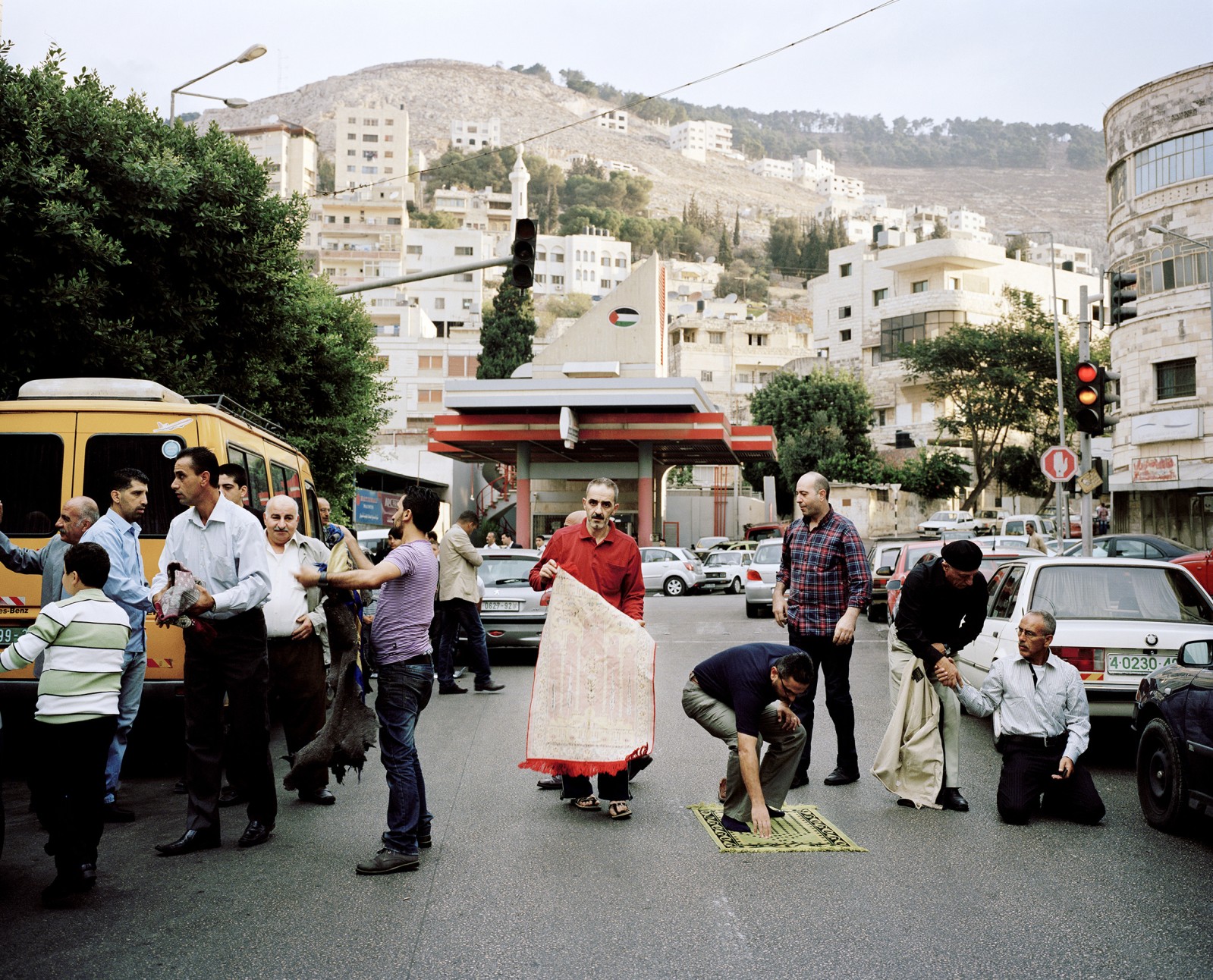 Fin de prière à l’extérieur de la mosquée Al Haj Ma'zoz pour l’Aid El Adha à Naplouse. Cette fête commémore la foi d'Ibrahim (Abraham dans la tradition juive) à son Dieu, symbolisé par l'épisode où il accepte d'égorger, sur l'ordre de Dieu, son fils unique Ismaël (Isaac dans le judaïsme). After the prayer, outside mosque Al Haj Ma'zoz in Nablus, during Eid al-Adha. This holiday celebrates the faith of Ibrahim (Abraham in Jewish tradition) in his God, symbolized by the episode in which he obeys his God’s command to slaughter his only son, Ishmael (Isaac in Judaism).