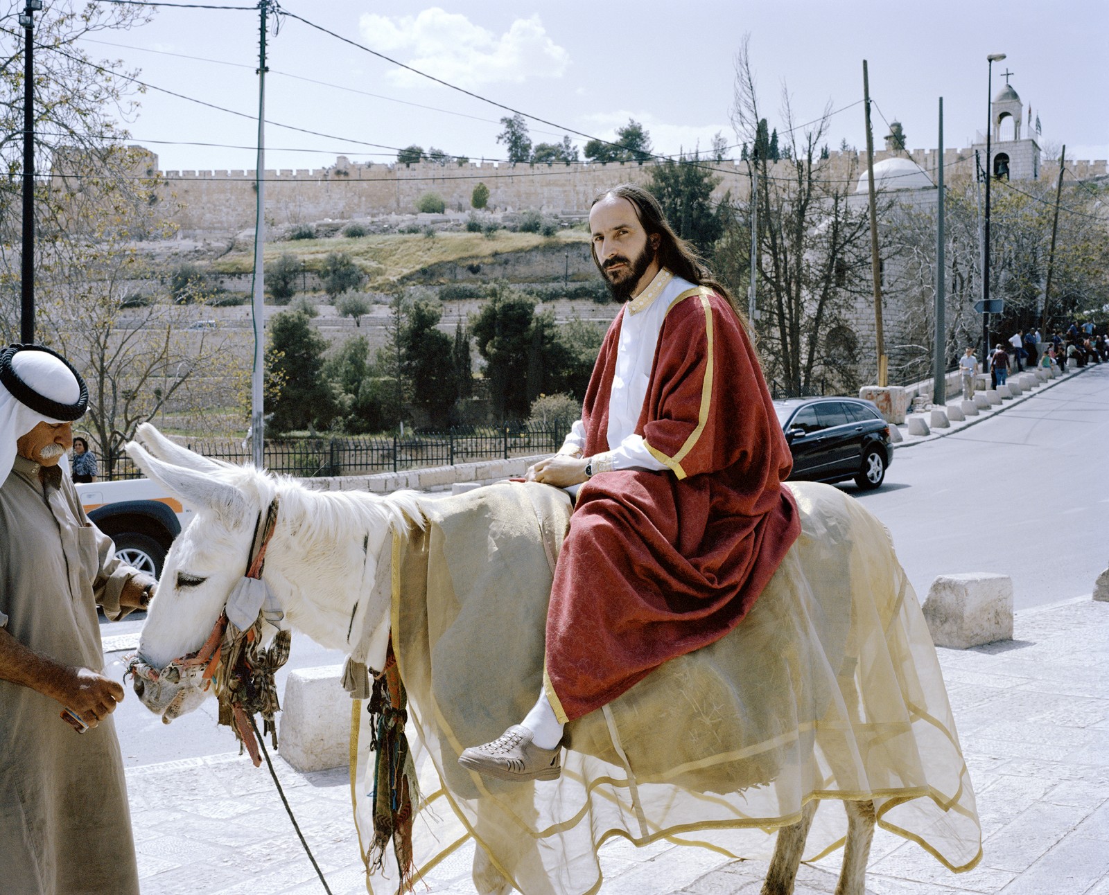 Homme à l’effigie de Jésus sur son âne, dimanche des Rameaux à Jérusalem. A man dressed as Jesus on his donkey, Palm Sunday, Jerusalem