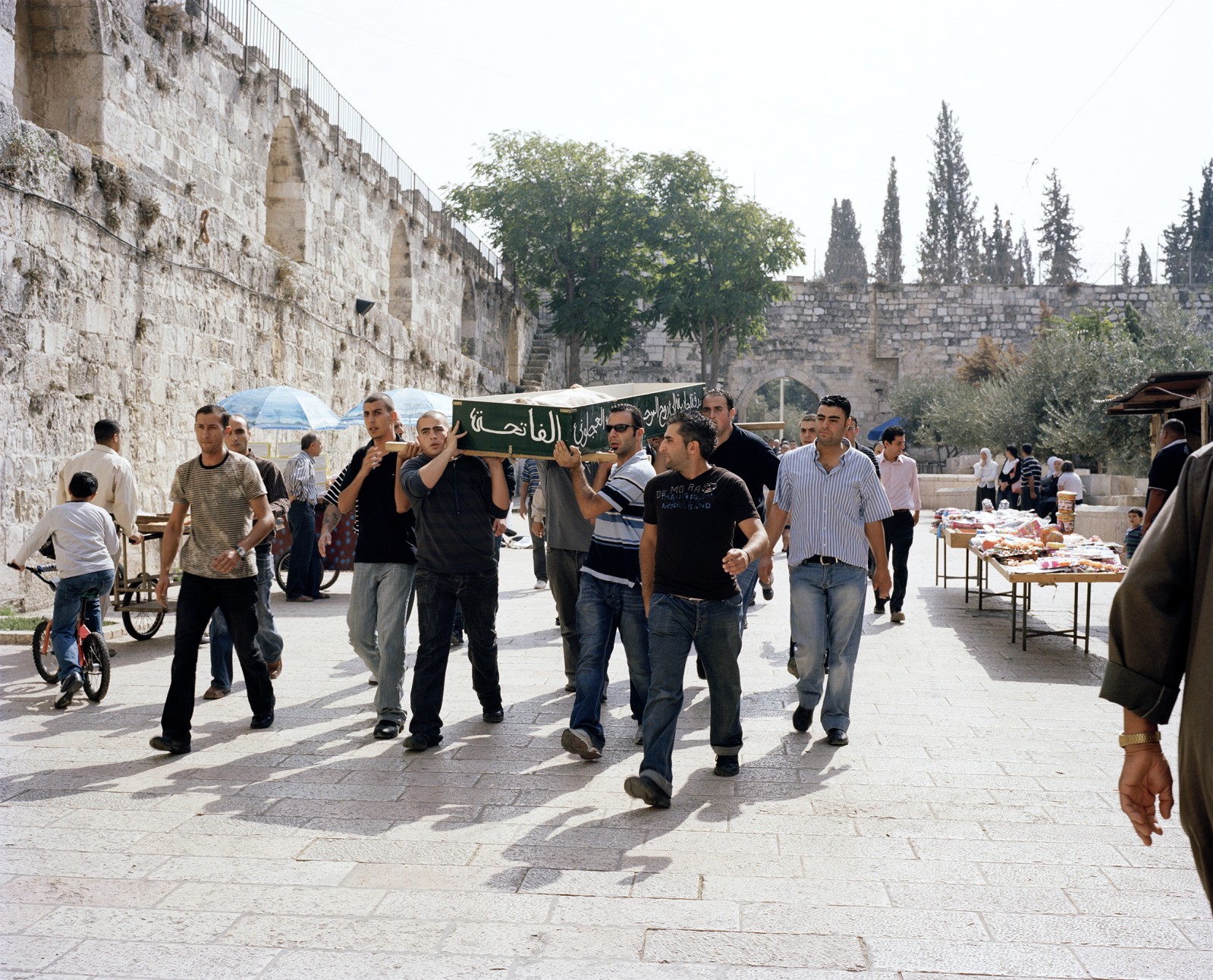 Cortège funéraire musulman sortant de la mosquée Al Aqsa à Jérusalem. Muslim funeral procession coming out of the Al-Aqsa Mosque, Jerusalem.