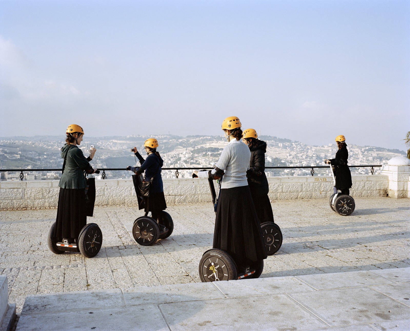 Groupe de jeunes femmes juives orthodoxes visitant Jérusalem sur des Segway. Group of young Orthodox Jewish women touring Jerusalem on Segways