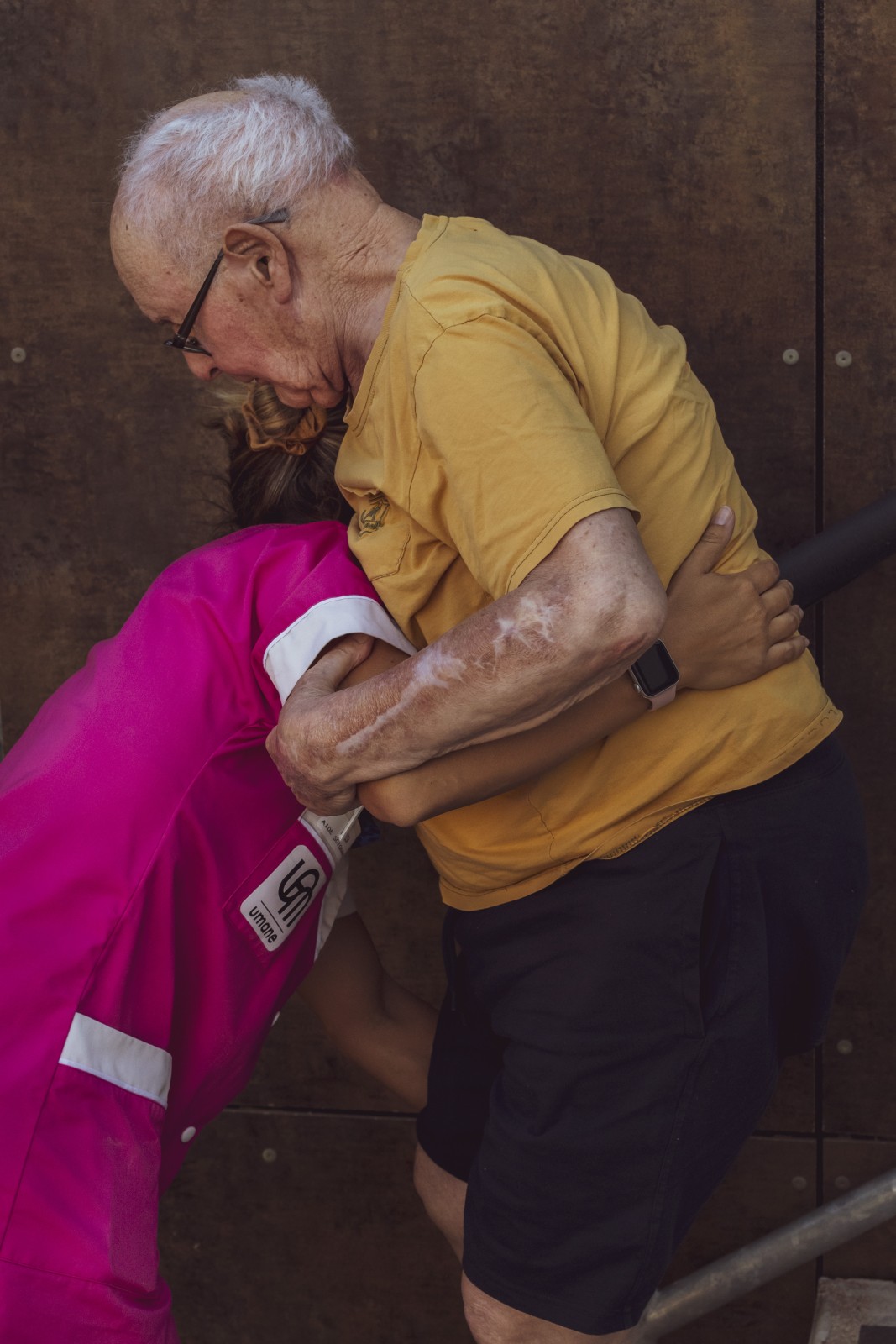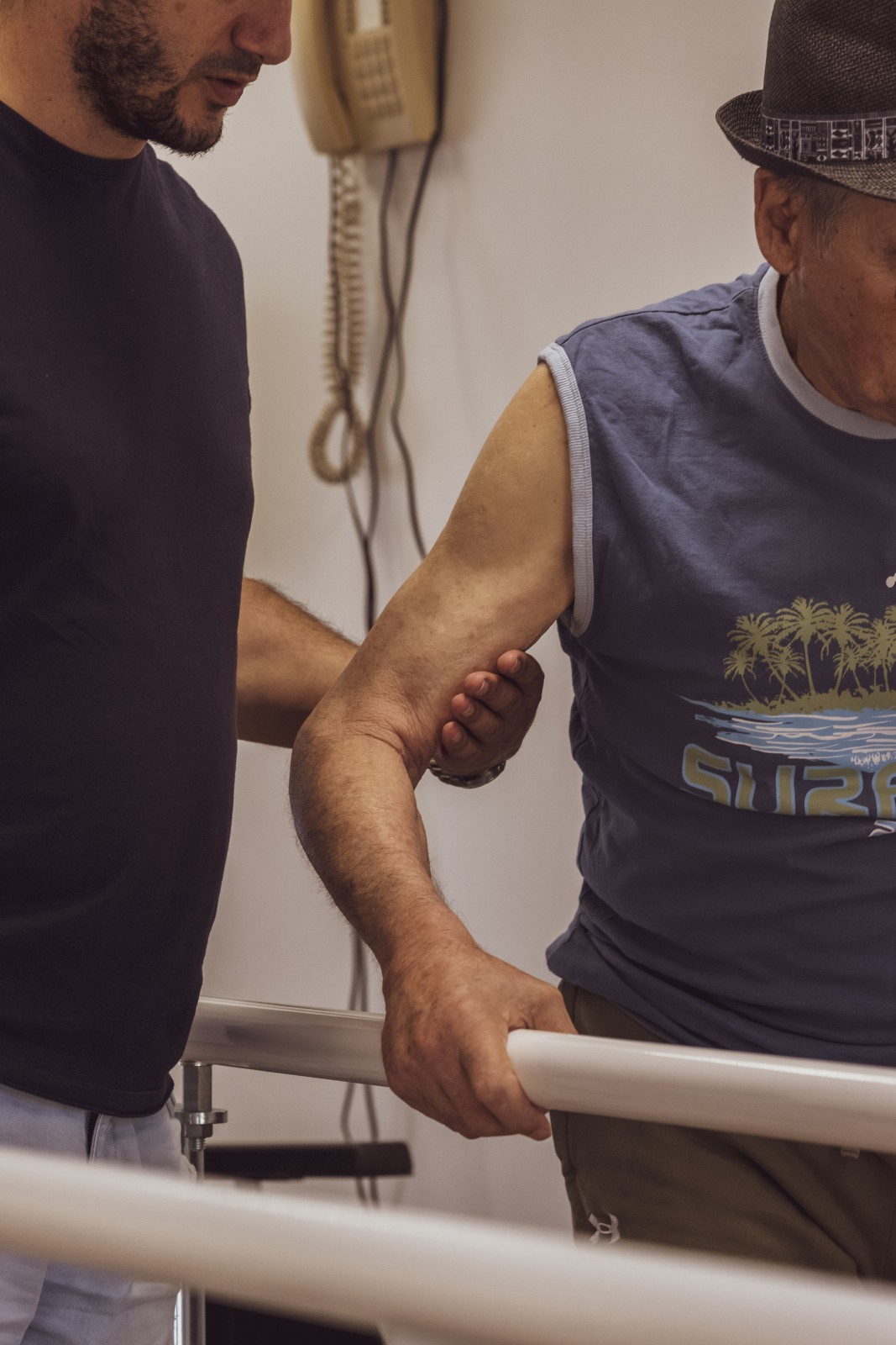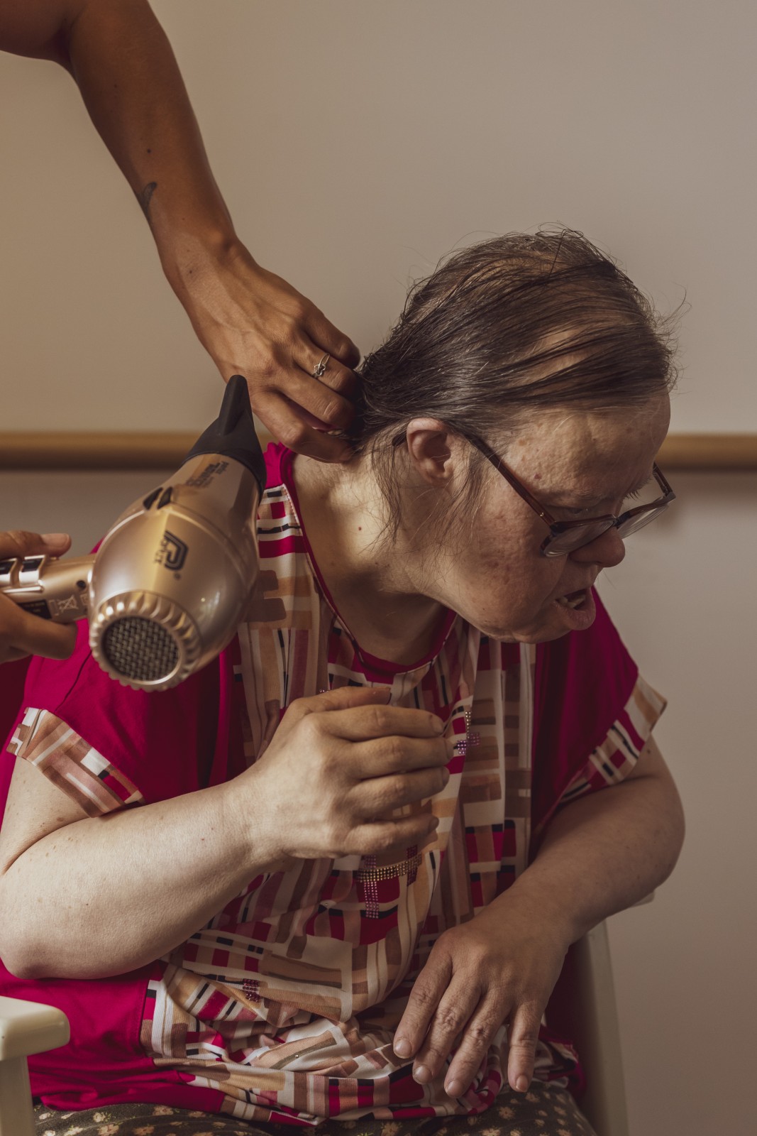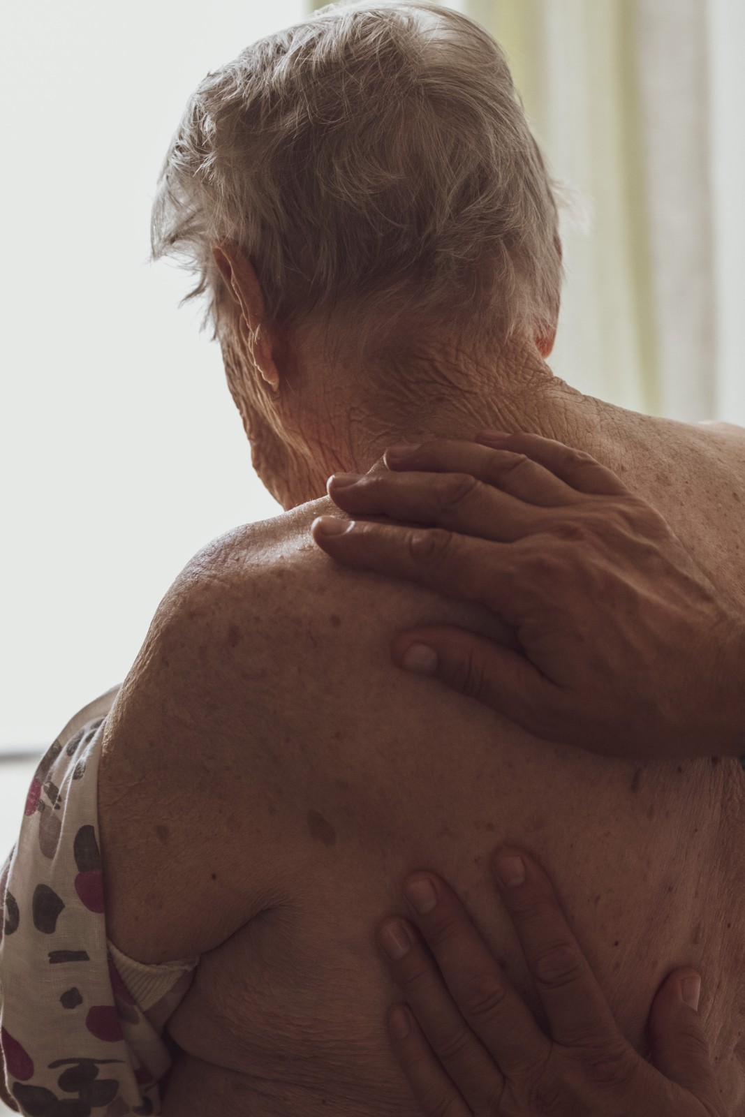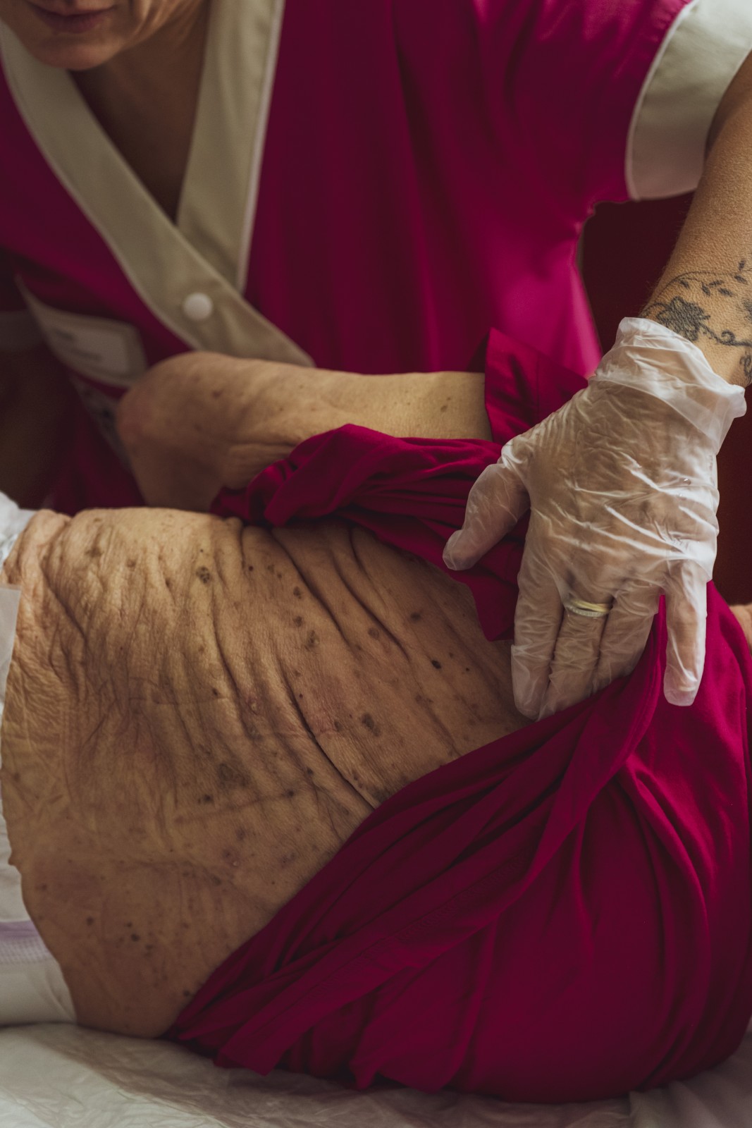 Ensemble de photographies sur la vieillesse des corps et sur les soins apportés par les soignants aux résidents d'un Ehpad, juillet 2025.