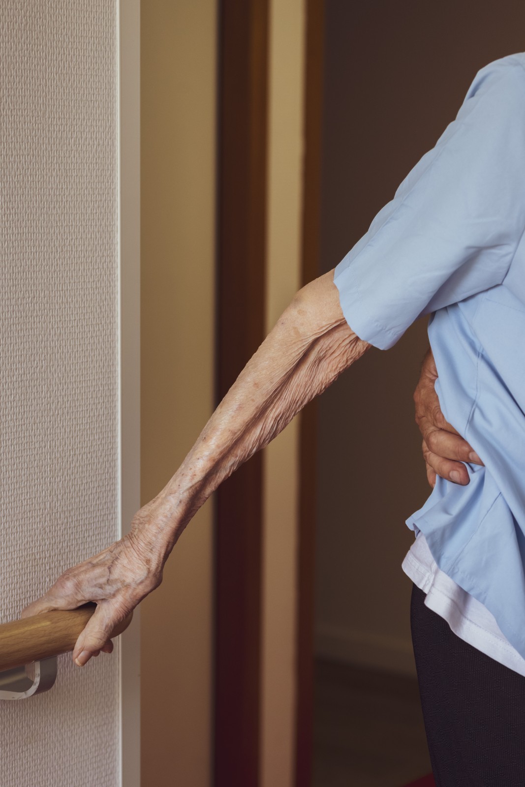 Une aide soignante aide une résidente d'Ehpad à se tenir debout