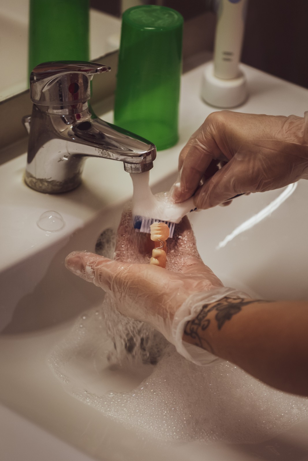 Soins précis et méticuleux de nettoyage d'un dentier apportés par une aide soignante dans un ehpad.