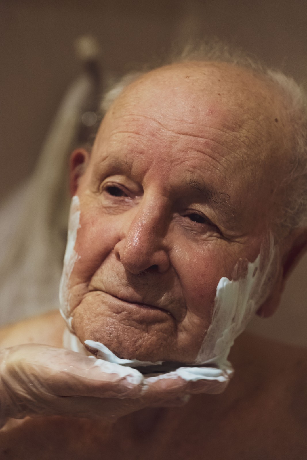 Soins précis et méticuleux de rasage effectués par une aide soignante pour le résident d'un ehpad