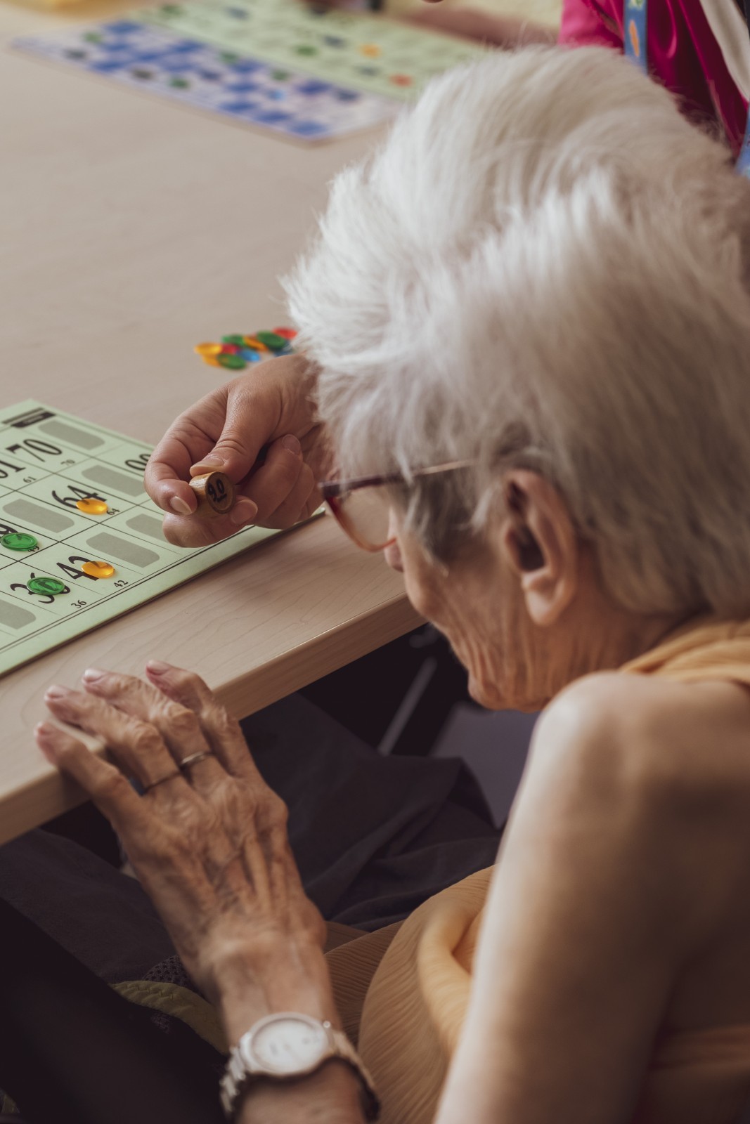 Une aide-soigante sollicite une femme âgée à lire le numéro d'un pion de loto dans un Ehpad