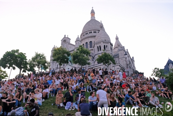 Une foule assisse au pied du Sacré Coeur attend le feu d'artifice.