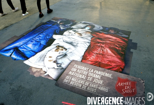 Aux halles, une oeuvre de street art de l'Armée du salut, alerte sur la situation des milliers de sans-abri en France.Elle represente trois sans-abris dans leur sacs de couchage aux couleurs du drapeau francais