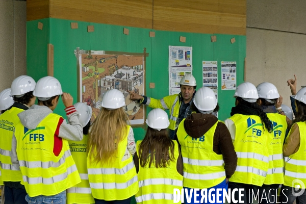©Xavier Testelin.Octobre2012.Paris.France.Les coulisses du batiment.Operation portes ouvertes de la Federation Francaise du Batiment vis a vis des jeunes et du grand public d'une liste de chantiers - Collegiens du college Jean Lurcat de Villejuif sur le site de renovation de la Maison de la Radio dans le 16 eme arrondissement, sur le site de renovation de la Maison de la Radio, chantier conduit par Spie Batignolles