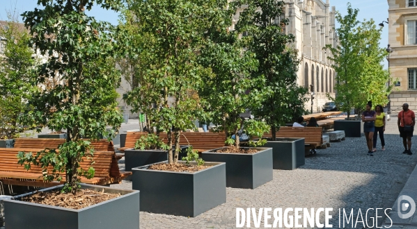 Aout 2018.©Xavier TESTELIN.Amenagement de la place du Pantheon avec aux quatre angles du batiment, des mobiliers et des ilots arborés.